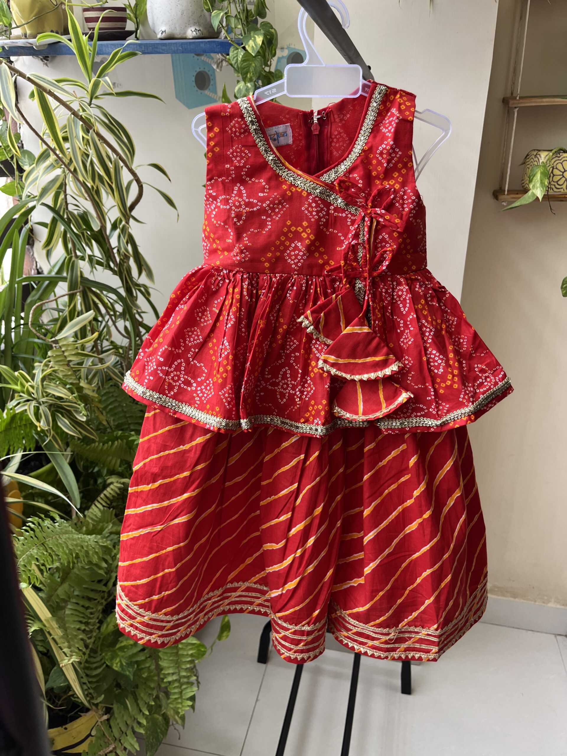 Red yellow leheriya lehenga with red bandhni angrakha peplum