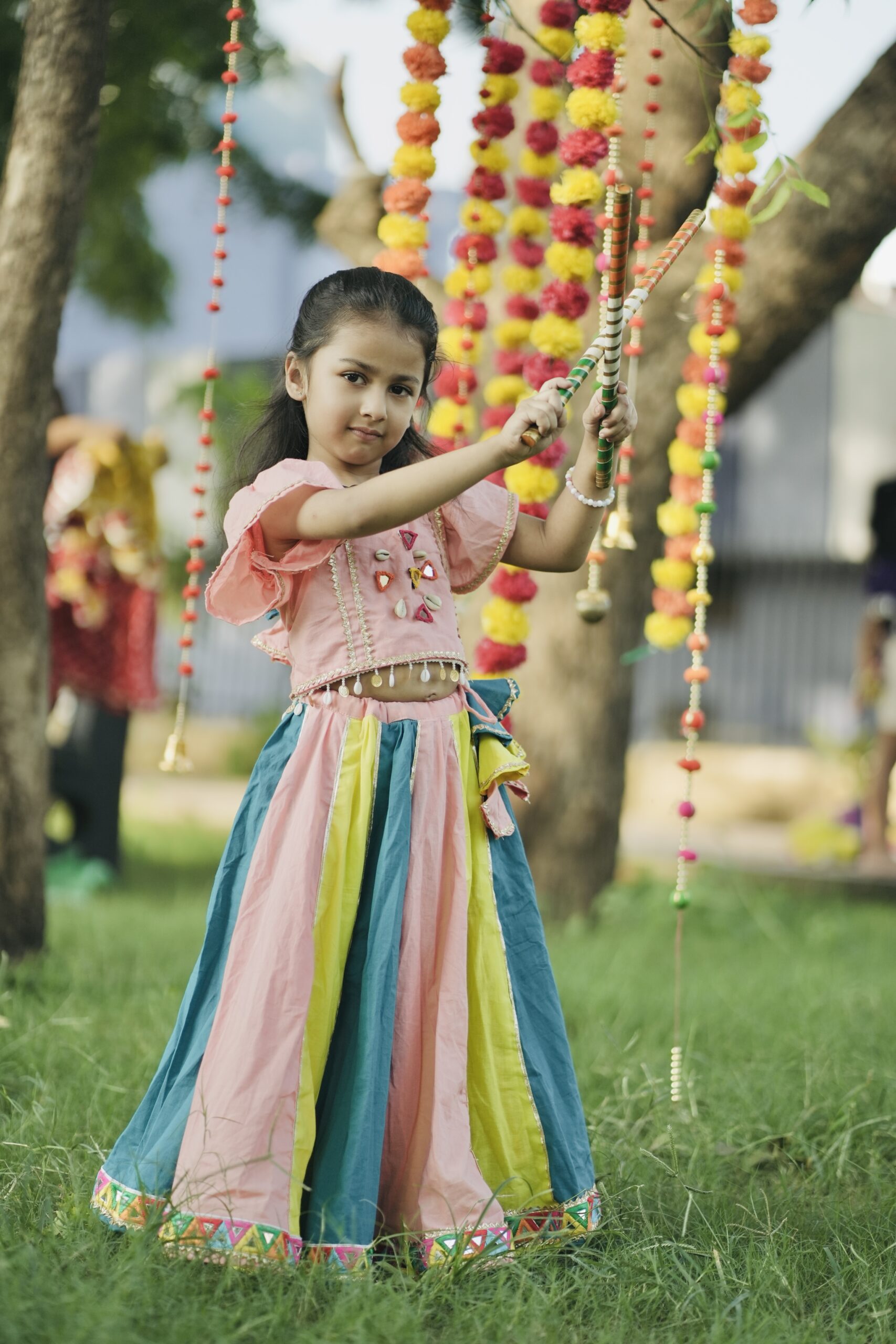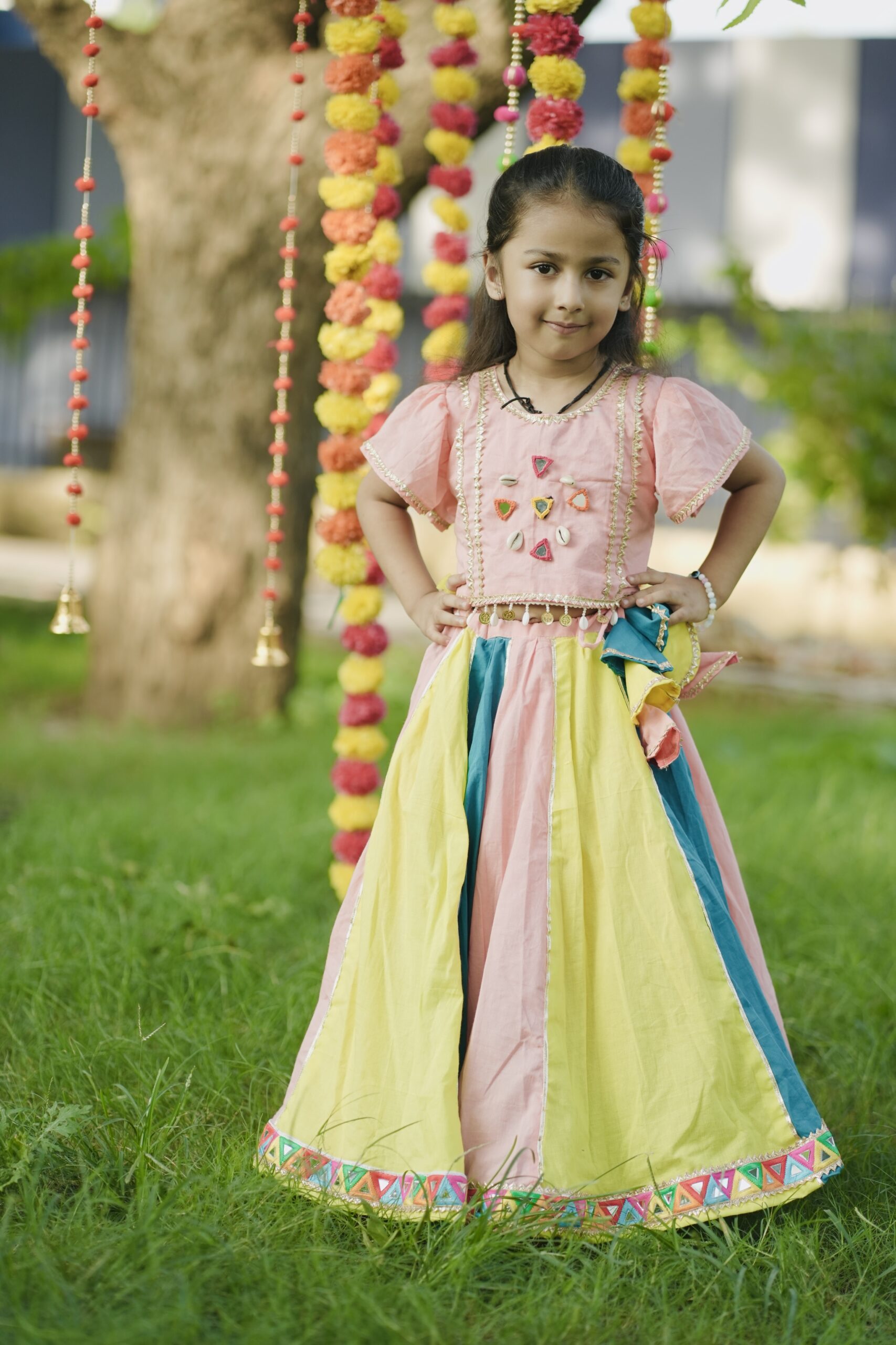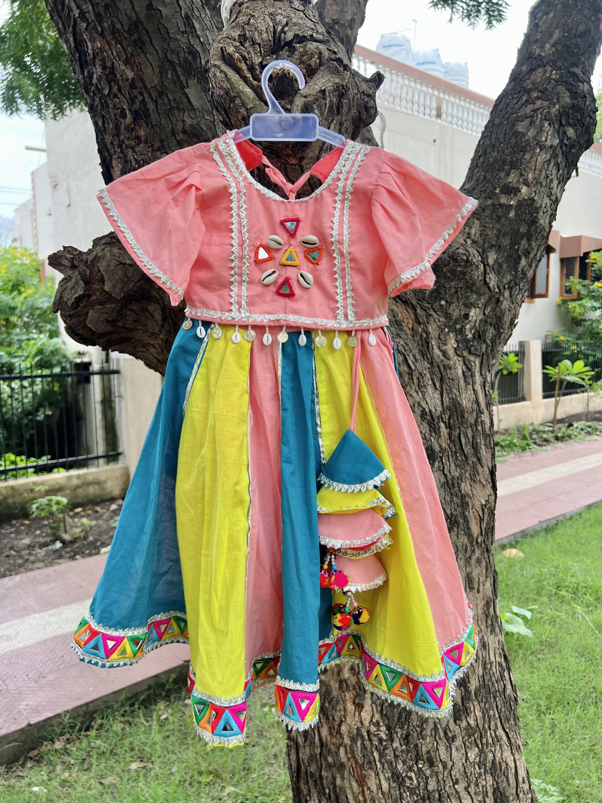 Teal blue peach and yellow kali lehenga with umberalla sleeves blouse