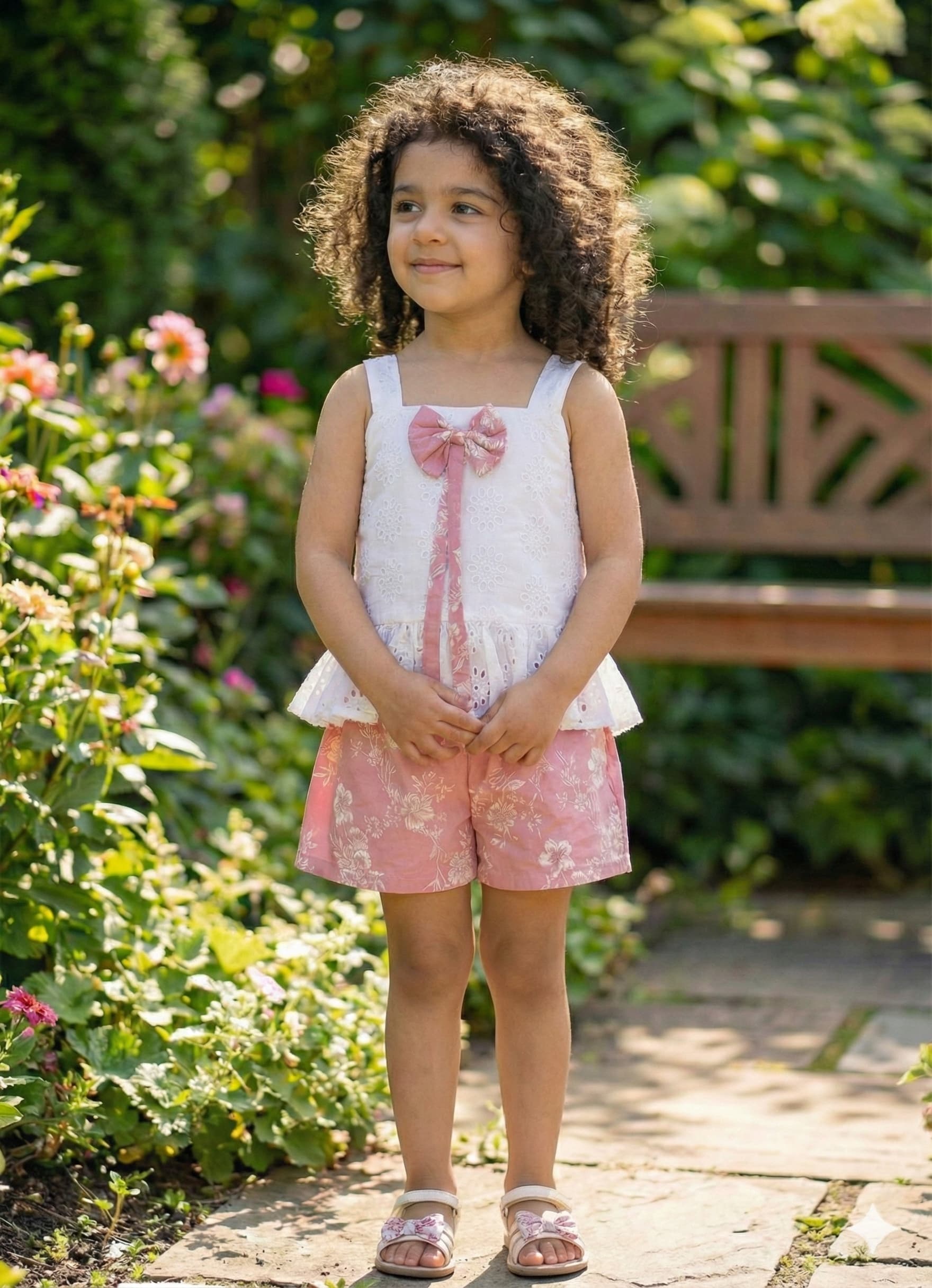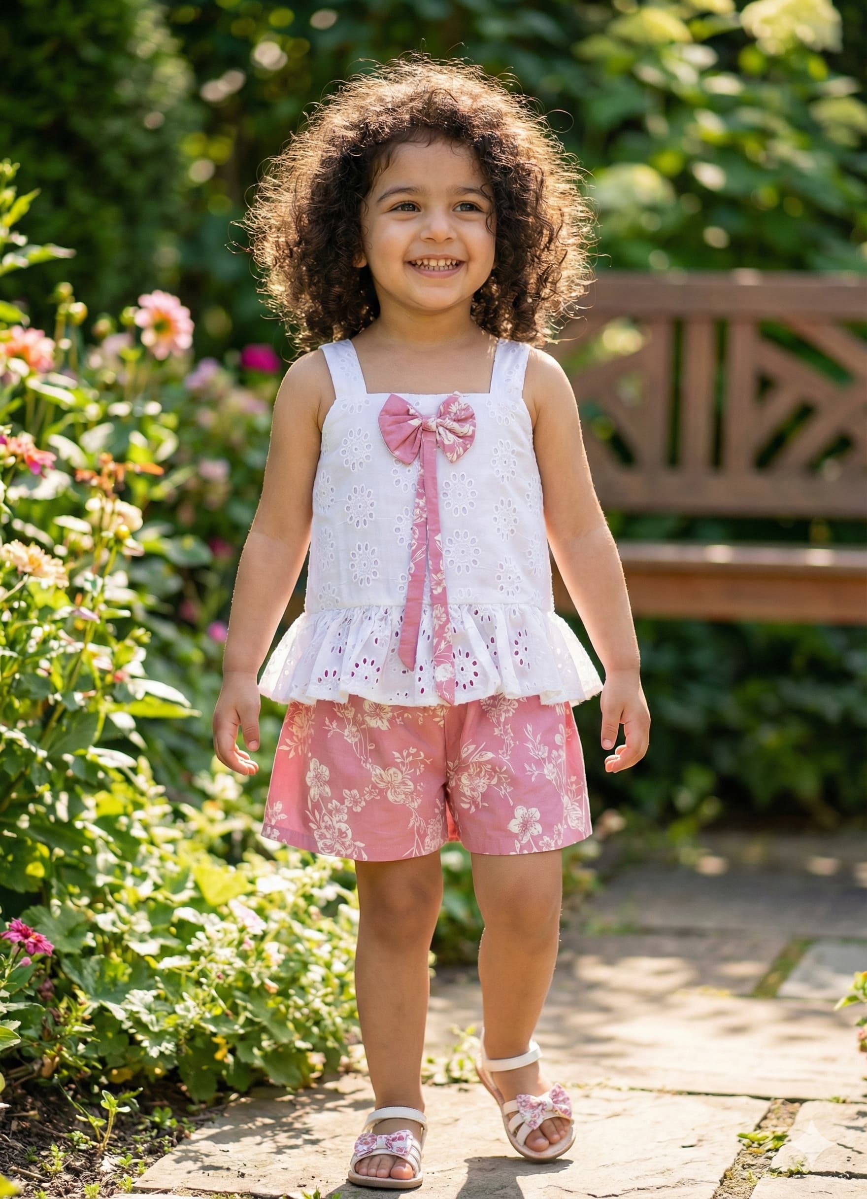 Embrace a blend of modern style and timeless elegance with our White Pink Schiffli Short Sets. Designed for versatility, this ensemble is perfect for casual outings, relaxing at home, or even chic brunchs.
