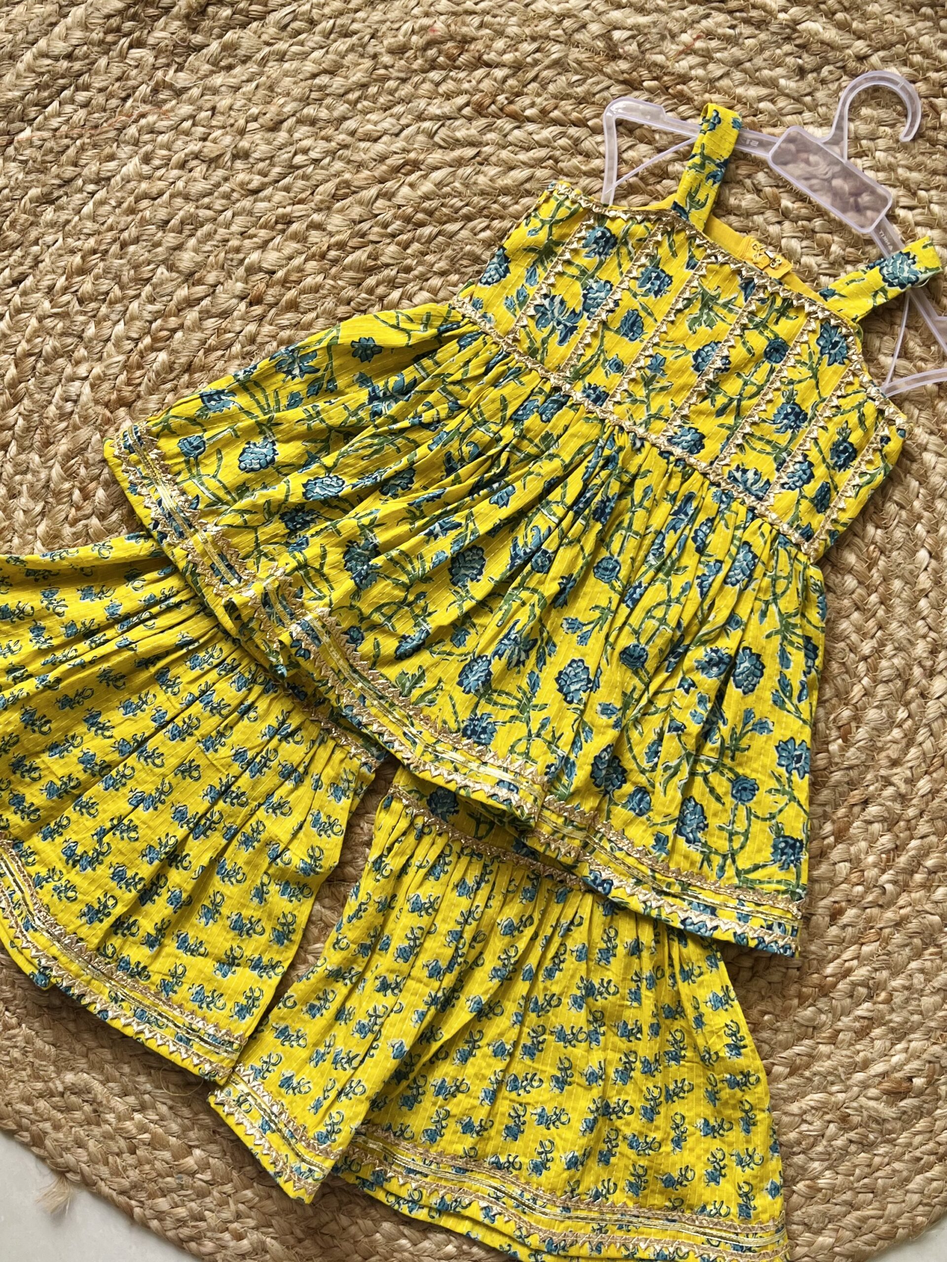 Yellow Sharara with blue Flowers w/o Sleeves